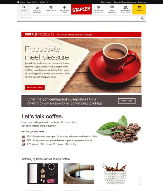 Above is the Staples Coffee Center landing page. The goal in creating this page was to position Staples as more than a supplier of office goods, framing them as partners to small businesses offering tips, advice and offers.