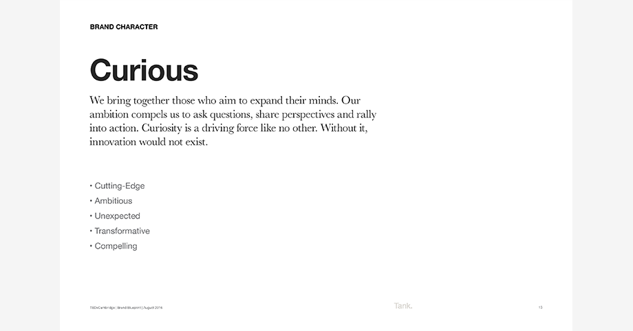 TEDxCambridge is a local extension of TED, putting on annual speaking events. A more fluid relationship with this client led us to a less traditional branding process, creating a brand blueprint based on informal workshops and our own understanding of the brand.
